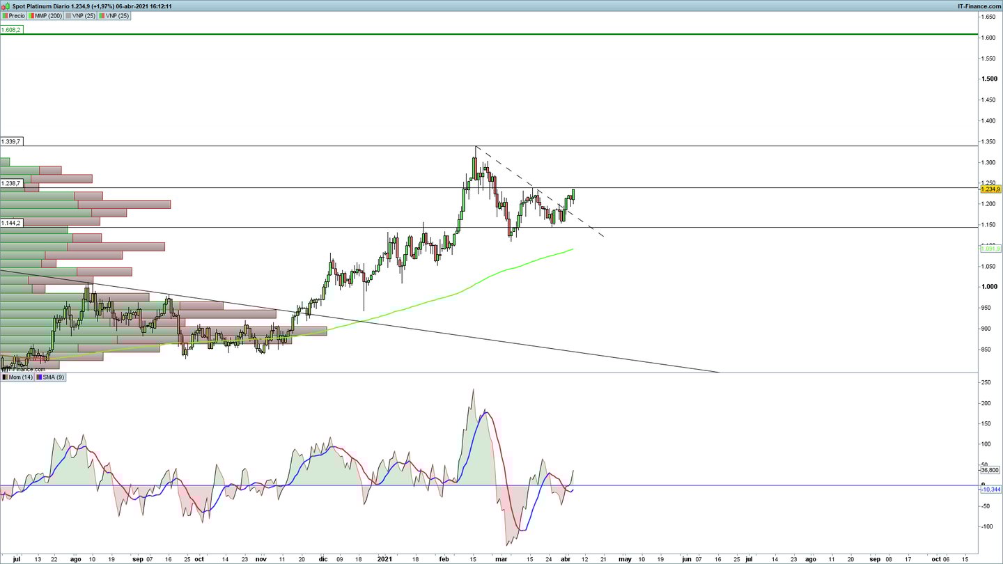 Después de haber consolidado en una fase correctiva, el precio del platino ha encontrado soporte en los 1144,2 dólares, ahora el primer nivel de resistencia se encuentra en los 1238,7 dólares, el siguiente estaría en los 1339,7. En caso de superar dicho nivel, activaría un objetivo por segundo impulso alcista en los 1608 dólares. La tendencia es claramente positiva.